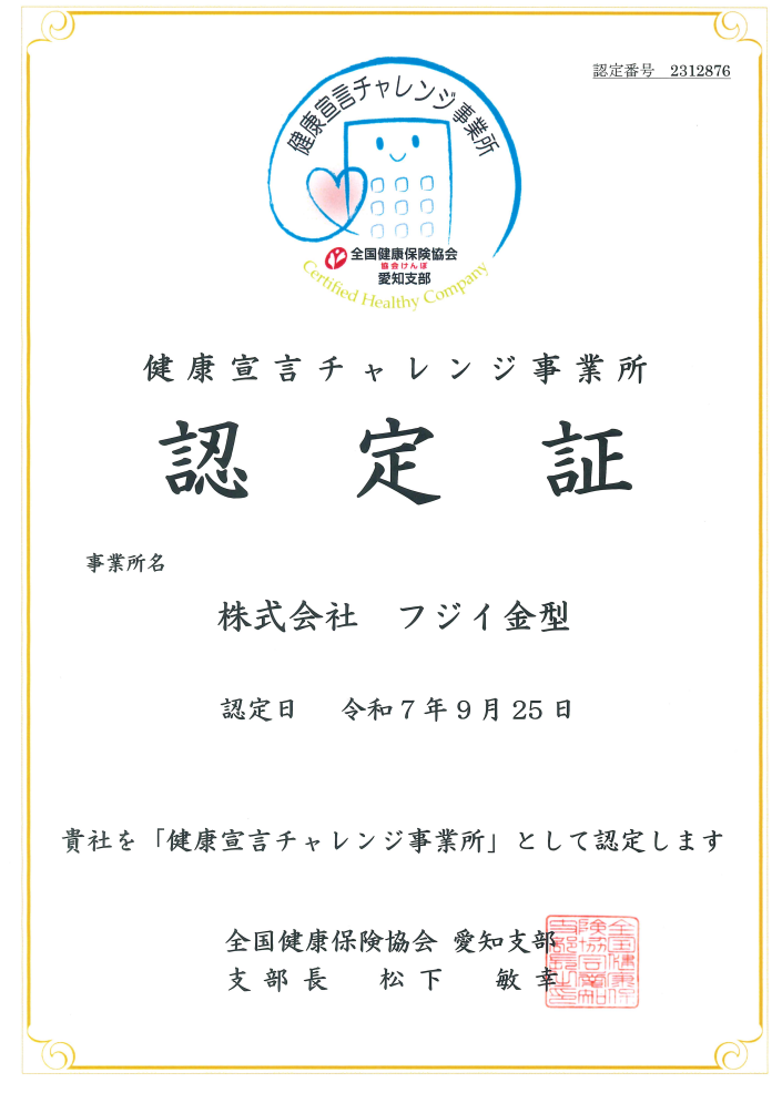 今回、この健康宣言およびそれに基づく取り組みが評価され、フジイ金型は、全国健康保険協会(協会けんぽ)愛知支部より「健康宣言チャレンジ事業所」に認定されました。
